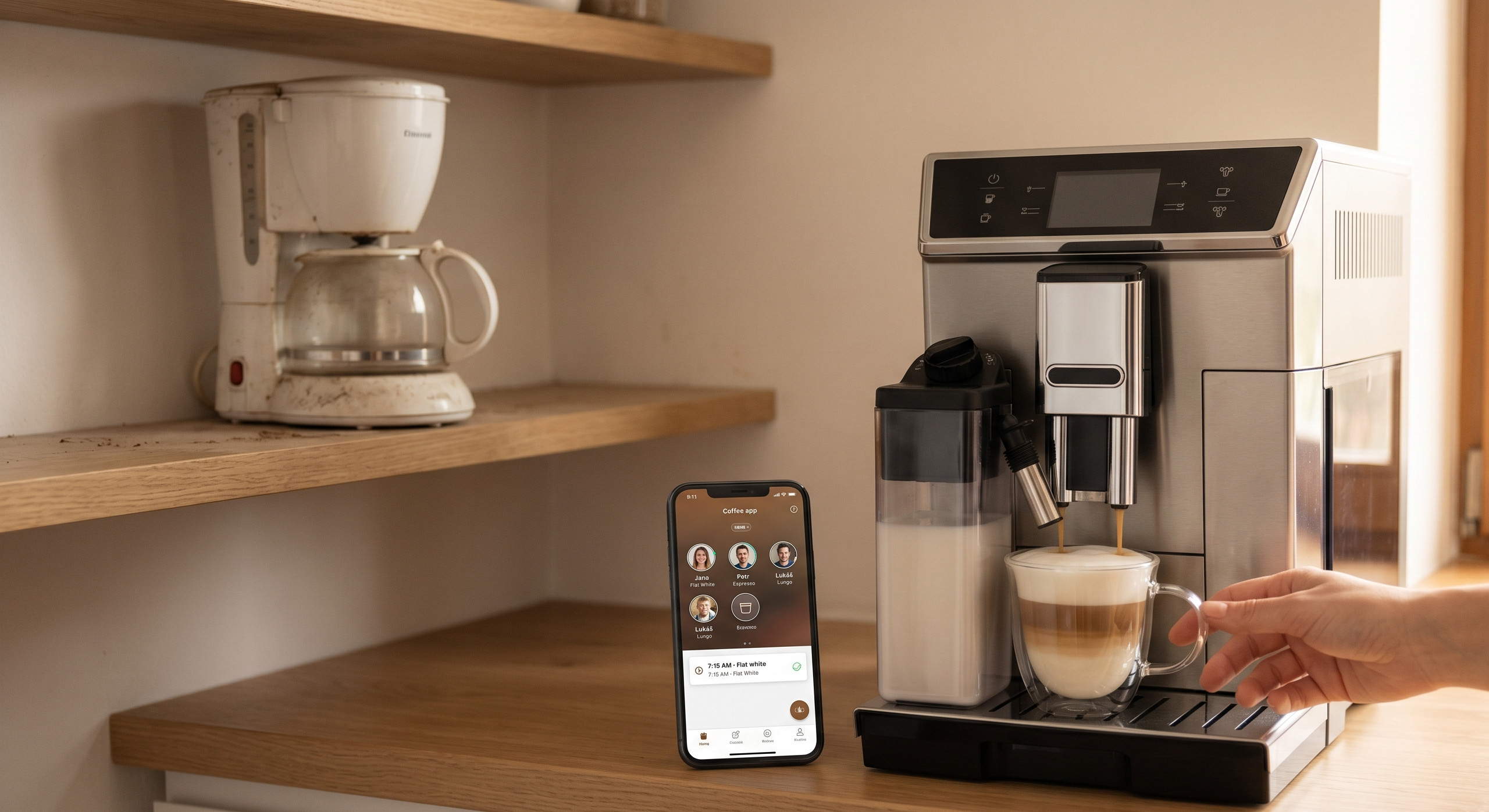 Představte si, že ráno zazvoní budík, vy se zavrtáte do polštáře a z kuchyně se mezitím začne linout vůně čerstvě mleté kávy. Nikdo tam není. Kávu si přesně na 7:15 naplánovala aplikace v telefonu, ještě včera večer. Přesně takhle vypadá realita nové generace domácích kávovarů, která v posledních letech postupně vytlačuje překapávače a starší automaty bez konektivity.