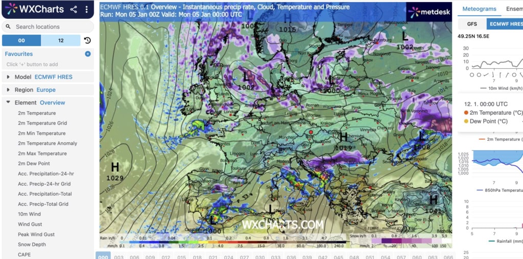 WXCharts je webová platforma, která ukazuje počasí tak, jak ho modelují samotné meteorologické modely. Nenajdete tady slovní shrnutí typu „bude chladno“, ale přehledné mapy teplot, tlaku, větru, mrazů a sněhových srážek rozdělené po jednotlivých hodinách. Právě to je zásadní rozdíl oproti běžným aplikacím. Pracovat lze s meteogramy deterministických modelů, tak i ansámbly.