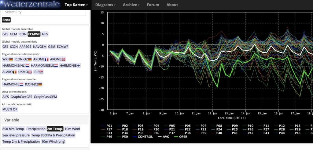 Platforma umožňuje sledovat takzvané ensemble předpovědi – tedy několik variant vývoje počasí najednou. Pro běžného uživatele to znamená jednoduchou věc: snadno poznáte, zda je předpověď jistá, nebo hodně nejistá. Když se všechny scénáře shodují, je vysoká šance, že mráz nebo sníh opravdu přijde. Pokud se rozcházejí, je dobré počítat s rezervou.