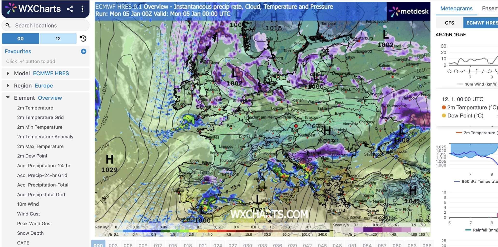 WXCharts je webová platforma, která ukazuje počasí tak, jak ho modelují samotné meteorologické modely. Nenajdete tady slovní shrnutí typu „bude chladno“, ale přehledné mapy teplot, tlaku, větru, mrazů a sněhových srážek rozdělené po jednotlivých hodinách. Právě to je zásadní rozdíl oproti běžným aplikacím. Pracovat lze s meteogramy deterministických modelů, tak i ansámbly.