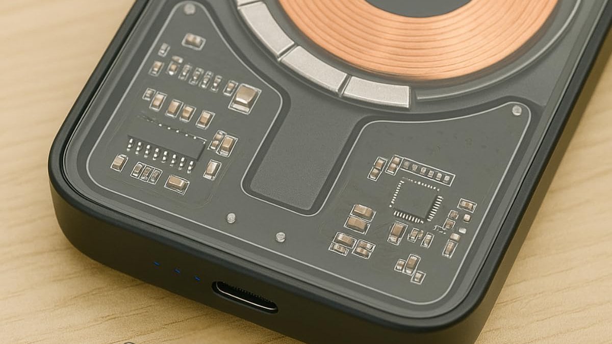 Právě transparentní konstrukce je tím, čím se tato powerbanka odlišuje od běžné konkurence. Skrz průhledný kryt je vidět vnitřní elektronika, řídicí obvody i výrazná nabíjecí cívka. Tu obklopuje kruh magnetů, které slouží k přesnějšímu uchycení telefonu pomocí MagSafe a zároveň přispívají k efektivnějšímu bezdrátovému dobíjení.