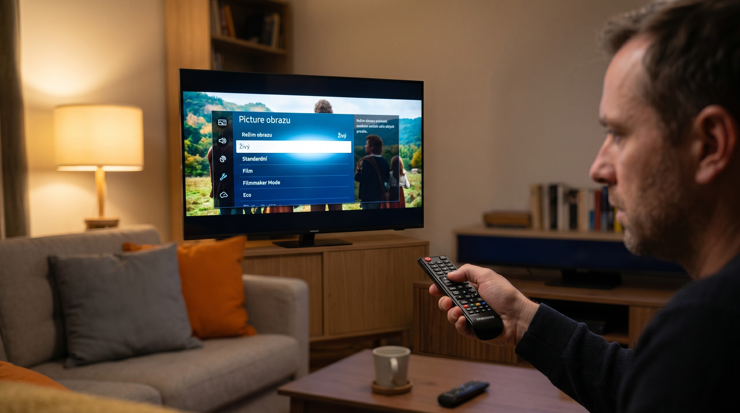 Skoro každá nová televize Samsung nebo LG se po prvním zapnutí přepne do režimu, který se jmenuje Dynamický, Živý, Vivid nebo Standard. Působí to jako rozumné základní nastavení. Ve skutečnosti jde o profil vyladěný pro přesvětlené prodejny, kde musí televize na zákazníka křiknout barvami i jasem. V obýváku je z toho ale úplně jiná disciplína. Čtyři stěny, jedna lampa, večer spuštěné rolety. Tam ten "showroom režim" zbytečně spaluje panel.
