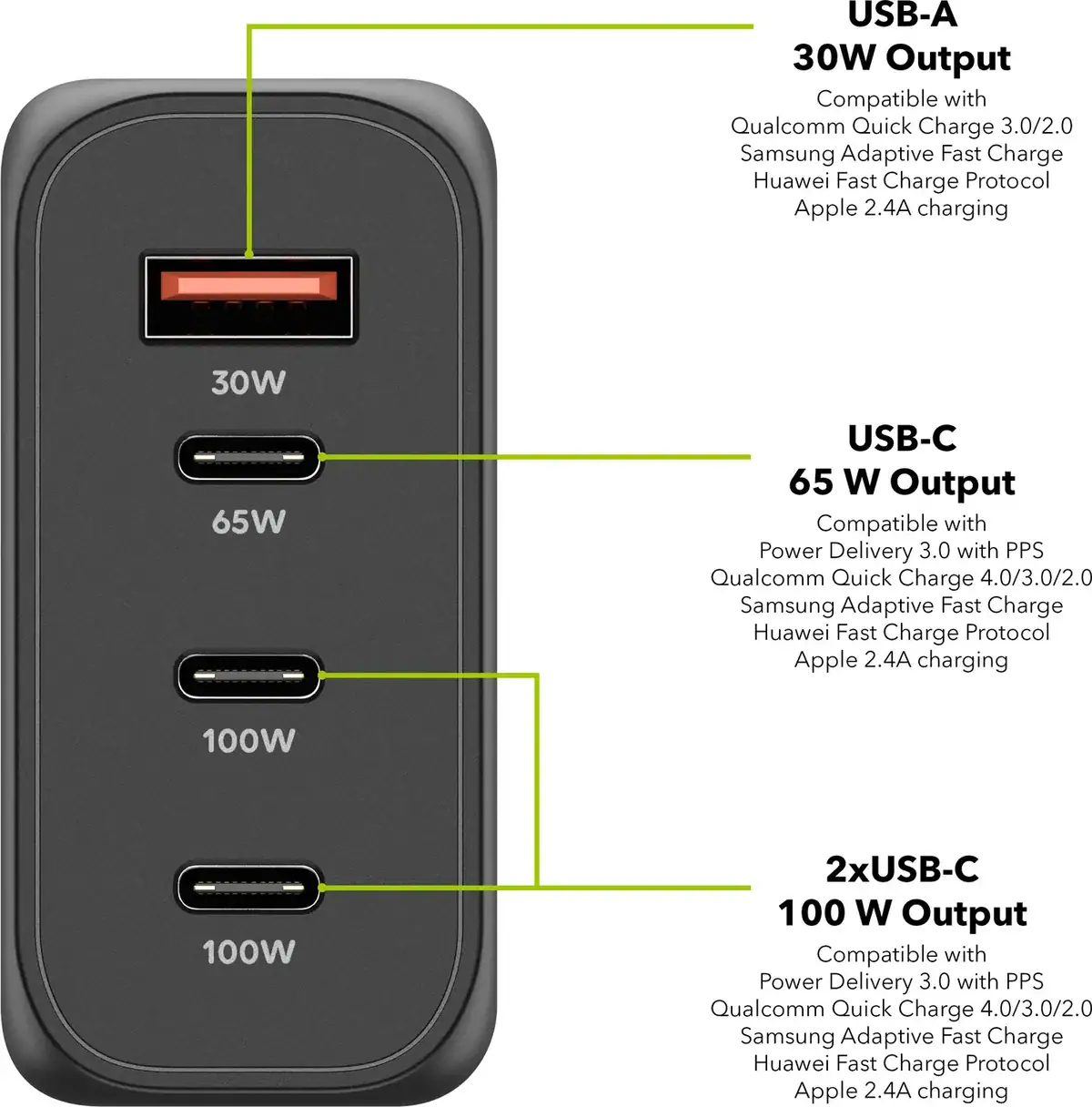 Tato nabíječka disponuje celkem čtyřmi výstupy. Najdete zde tři moderní USB C porty a jeden klasický USB A konektor. Nejdůležitějším parametrem je celkový výkon 100 W. V praxi to znamená že adaptér bez problémů utáhne i výkonné notebooky jako je MacBook Pro nebo pracovní stanice od značek Dell a Lenovo.