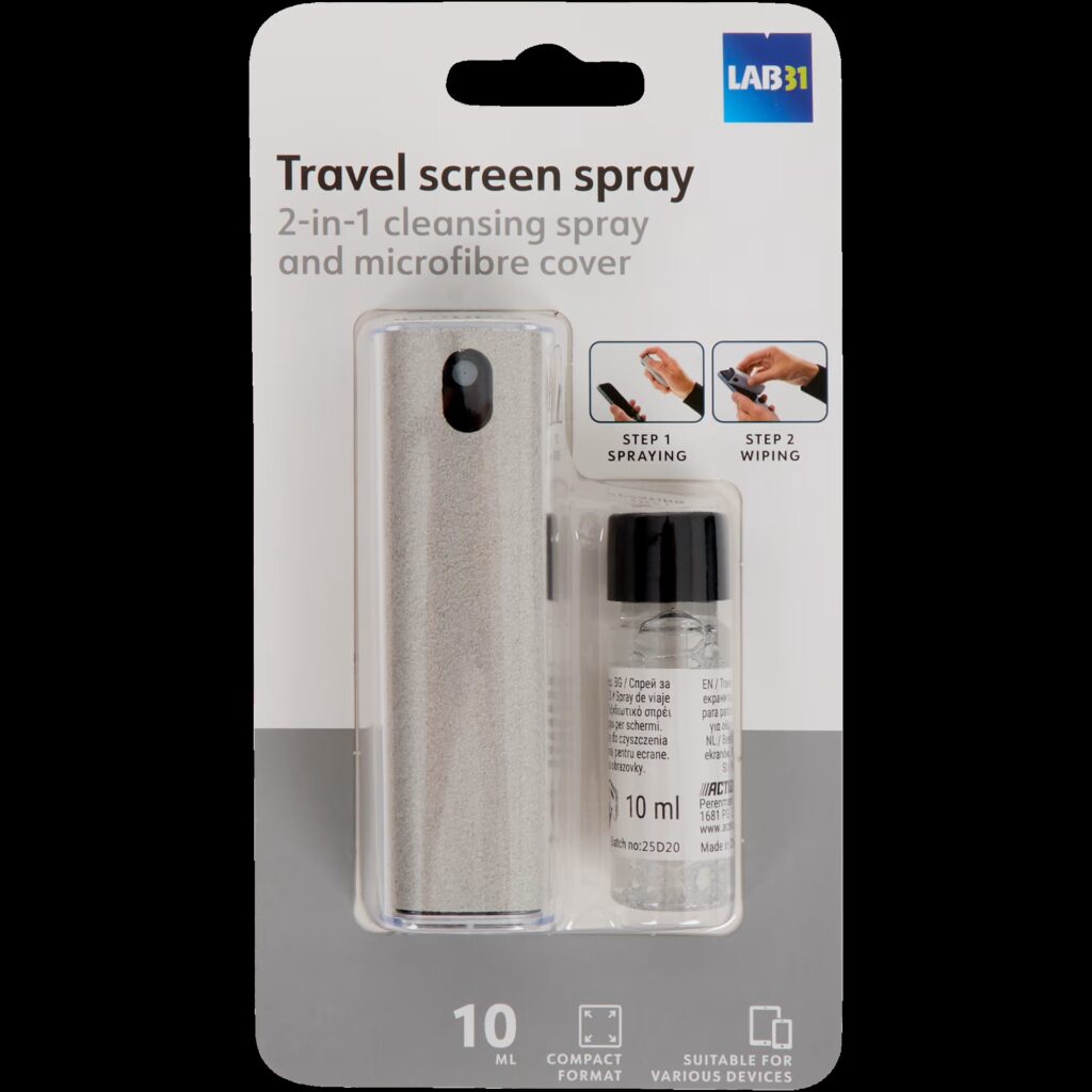 Řešením je speciální čistič obrazovky značky Lab31, který aktuálně nabízí prodejny Action. Nejde o klasický sprej s hadříkem zvlášť. Celý produkt je navržený jako kompaktní kvádr, který v sobě spojuje obě funkce najednou.