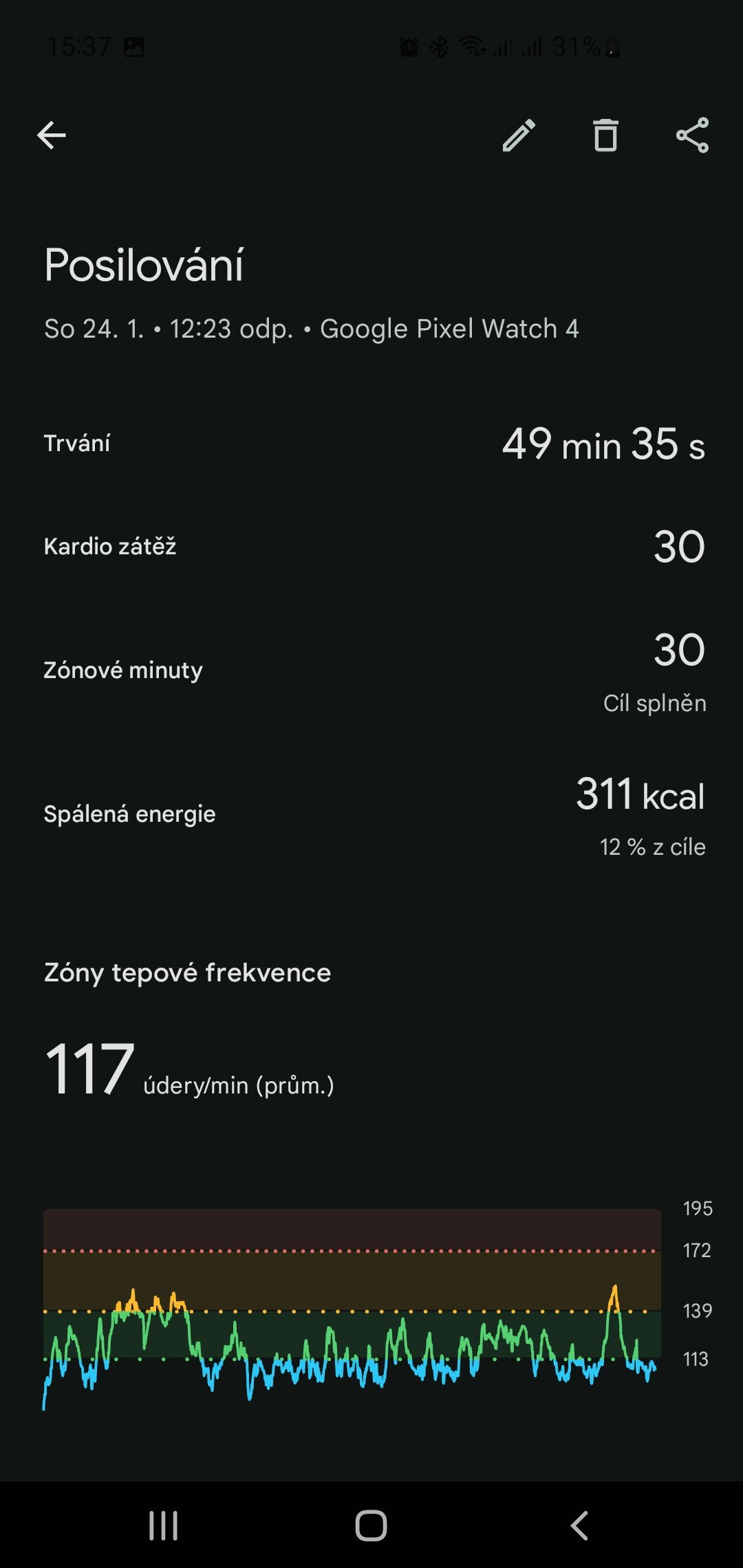 Všechny sportovní a zdravotní funkce zastřešuje platforma Fitbit. V té naleznete údaje jako tepoka, spálené kalorie, stav tréninku, doba zotavení či dlouhodobý vývoj VO2 Max. Stejně jako u Pixel Watch 3 ani čtvrtá generace mě svou přesností nezklamala. Tepovku jsem srovnával s hrudním pásem Polar H10+ a křivky byly během silového tréninku téměř totožné.