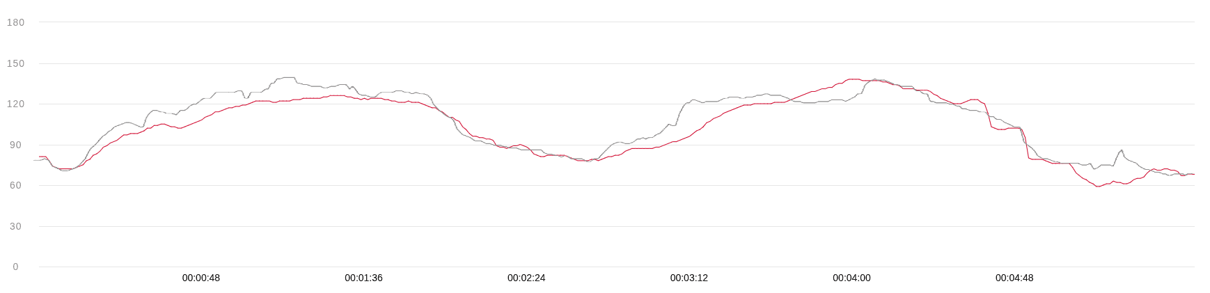 Šedá křivka –⁠⁠⁠⁠⁠⁠ Xiaomi Watch S4, červená křivka –⁠⁠⁠⁠⁠⁠ Polar H10+. Foto: Martin Dajča